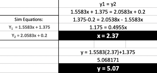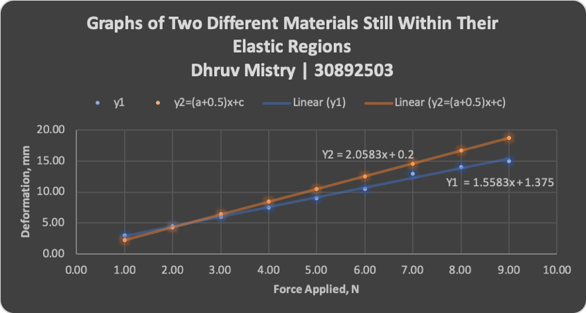 Mathematically, where the two lines intersect it can be assumed that the materials are extended by the same amount when the same load is applied. With this in mind, if we set the equations of Y1 and Y2. To each other, we can solve them simultaneously. When solved, it is determined that the lines intercept at the instances where the force applied was equal to 2.37N, and the deformation was 5.07mm.