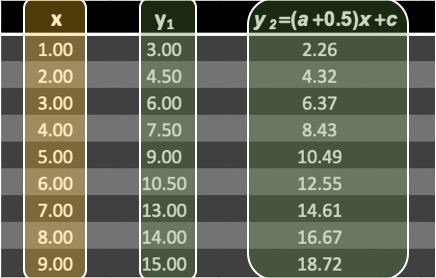 The data given are x (force applied in Newtons) and y1 and y2 (deformation in mm).