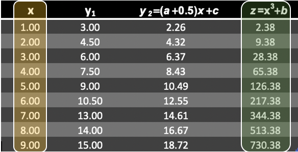 The data given are x (force applied in Newtons) and material z (deformation in mm).